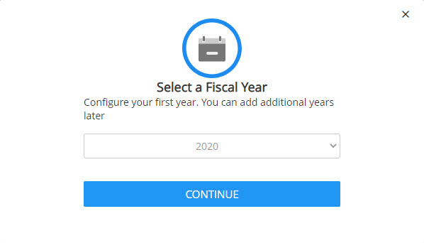 2. A popup will appear asking users to select the first fiscal year to configure. This is typically going to be only a couple years prior to the current calendar year, in order to load historical data. If you are unsure, you can always add years later.