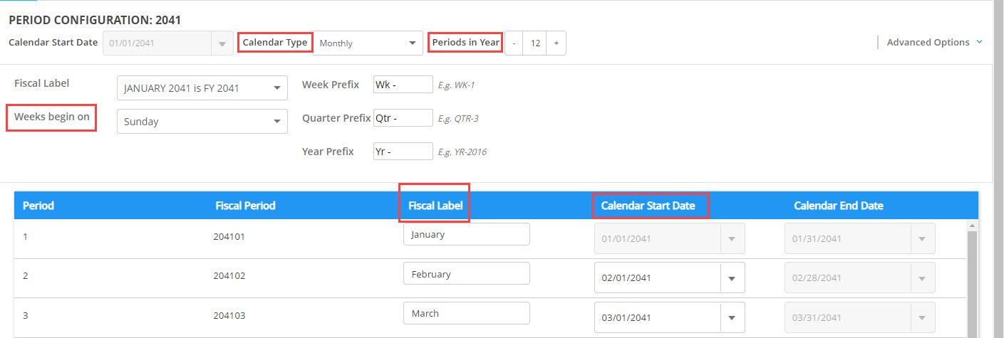 3. After clicking Continue, the fiscal year configuration will appear. It defaults to a standard calendar configuration where each period is representative of its respective month (ie the month of January represents Period 1). Users have the ability to change the following