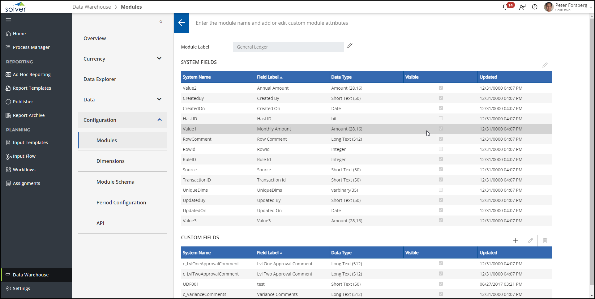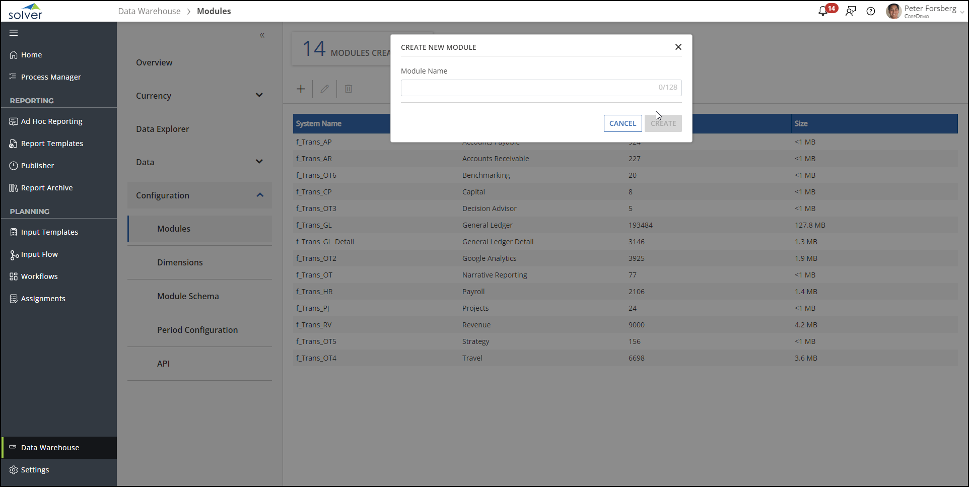Modules, also referred to as factsets, store your transaction information such as General Ledger and General Ledger Detail. Solver comes with these two modules out of the box with the ability to create an unlimited number of modules. At the very top of the Configuration > Modules menu, users will see a count of the number of modules that have been created.