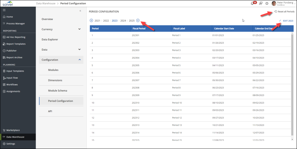 Upon logging into Solver and navigating to the Data Warehouse menu, if periods are not configured, on the Overview page, users are informed to configure their periods. Click the Period Configuration link to begin
