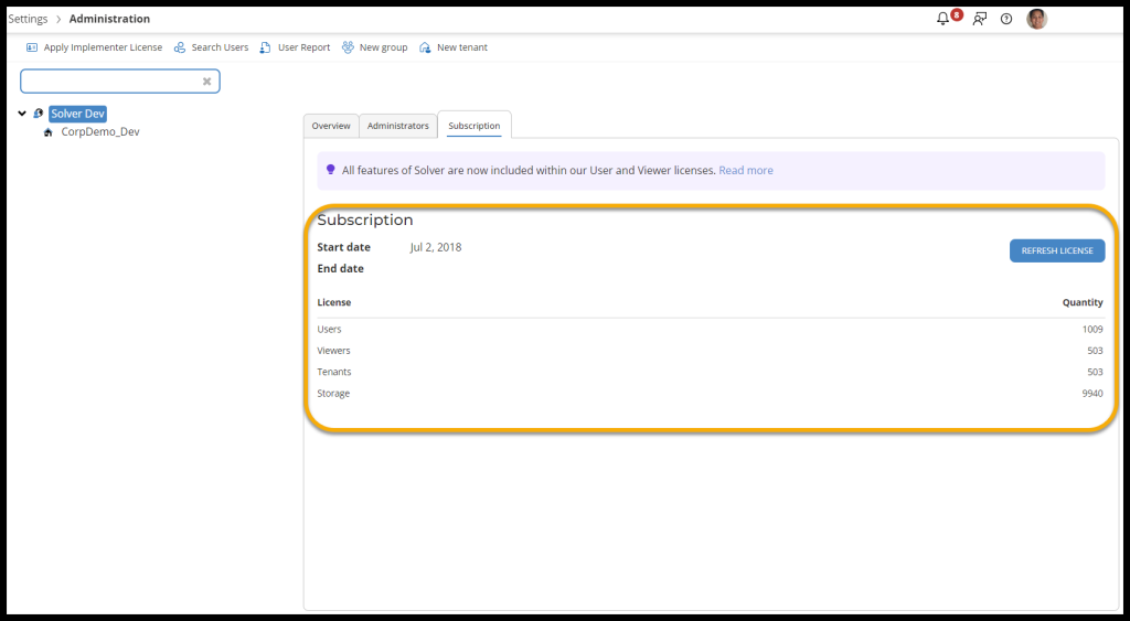 - Module and Dimension limits have been lifted. Users will see the count of their Modules and Dimensions that have been created instead of the count of the amount available. This allows for more Modules and Dimensions to be created than before allowing you to bring more data into Solver. The modified version of this can be seen below.