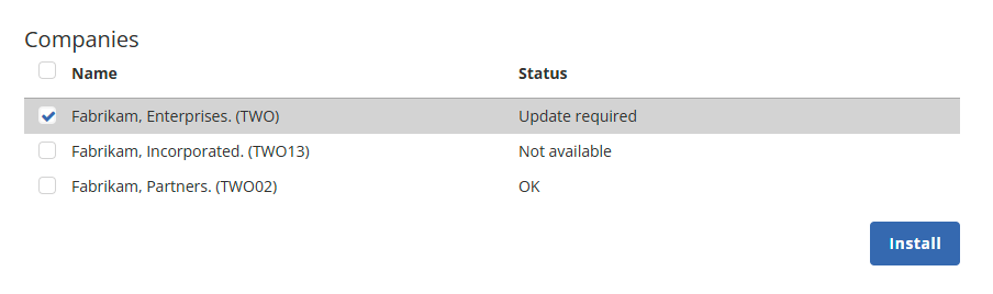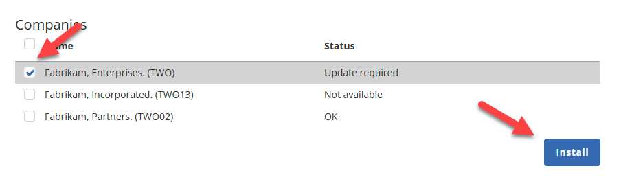 - Select a company where you would like to install/configure Budgeting and click Install.