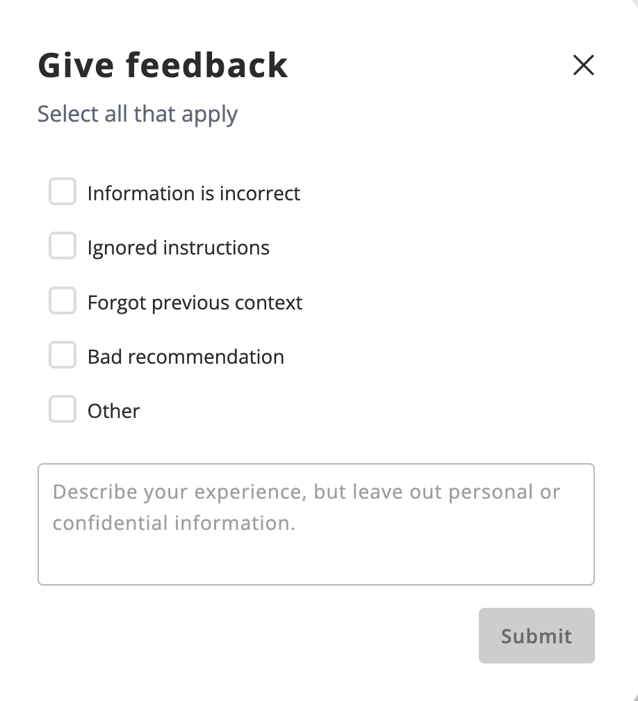 - When you mark a response as unhelpful (👎), you’ll be prompted to provide feedback. You can select one or more reasons:
