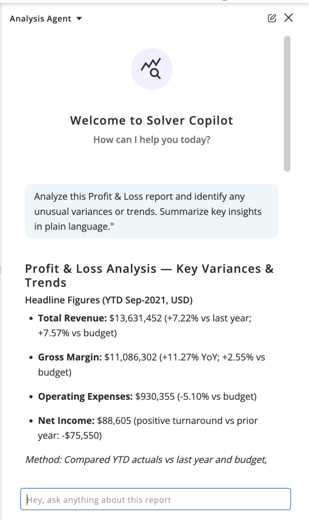 Solver Copilot Analysis Agent is a new AI-powered feature designed to help you analyze reports faster and uncover deeper insights with ease. Built on Microsoft Azure OpenAI GPT technology, this agent is part of Solver’s AI-first initiative to transform financial planning and analysis (xFP&A) through intelligent automation.