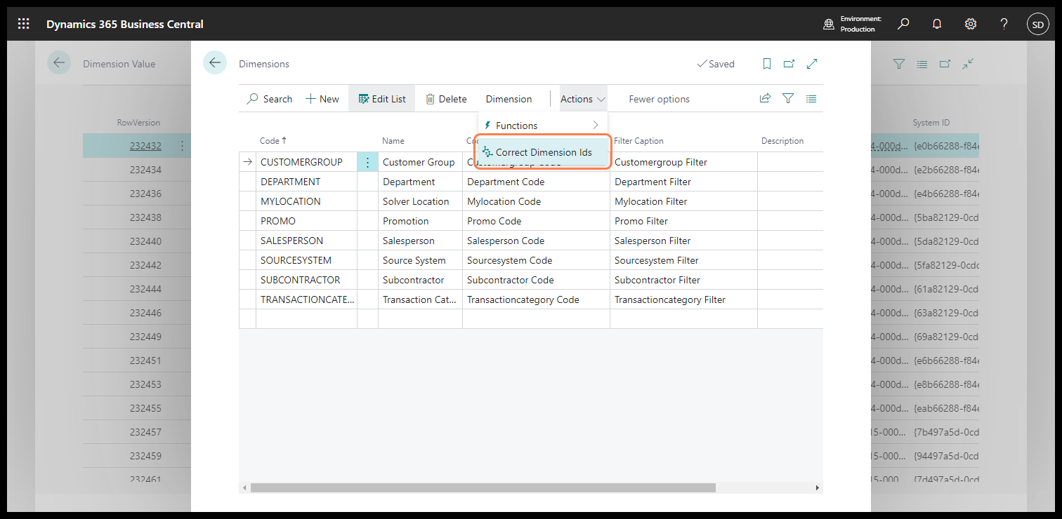 - Click on the Actions menu button and choose Correct Dimension Ids.
