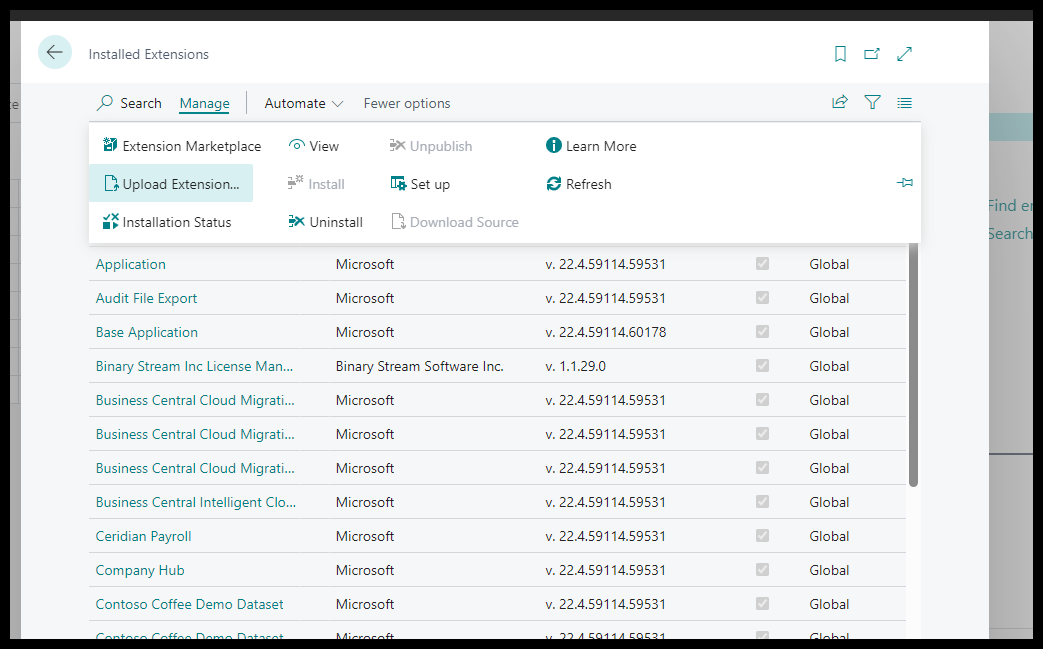 The following steps will require a Business Central admin and the installation of the .app file found within a .zip file at the bottom of this article. Unzip this file to extract the .app file.