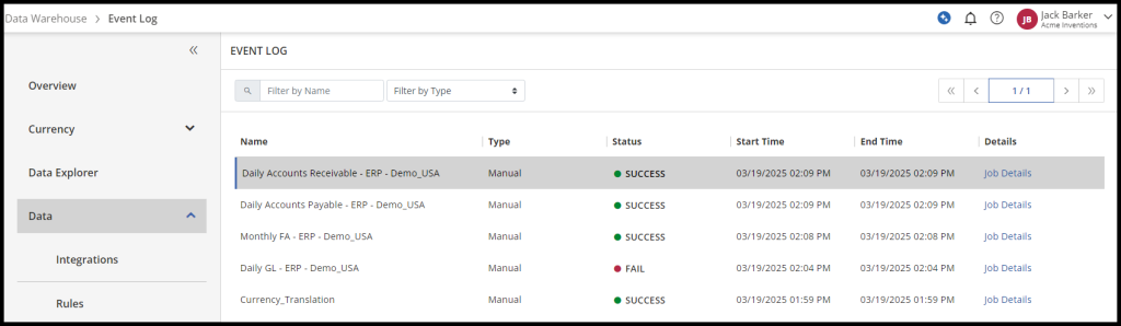 The event log allows the user to view information on the previously ran integrations, rules and jobs. This screen is very useful when troubleshooting a failed process.