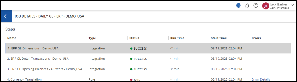 Error Details: If any Integration, Rule or Job should fail, there will be a hyperlink to the error details underneath the “Errors” column.