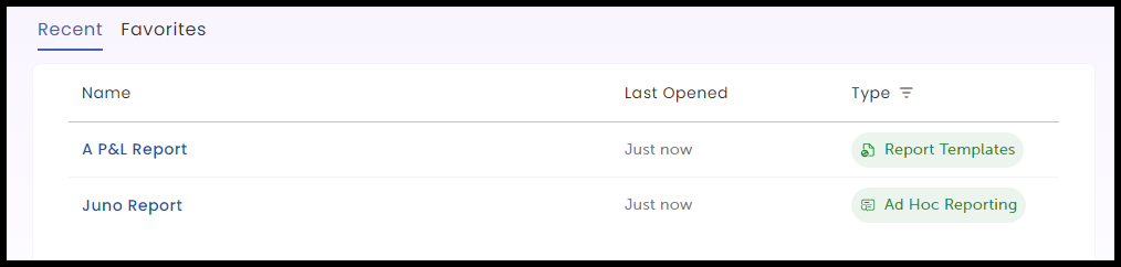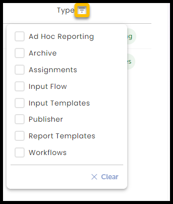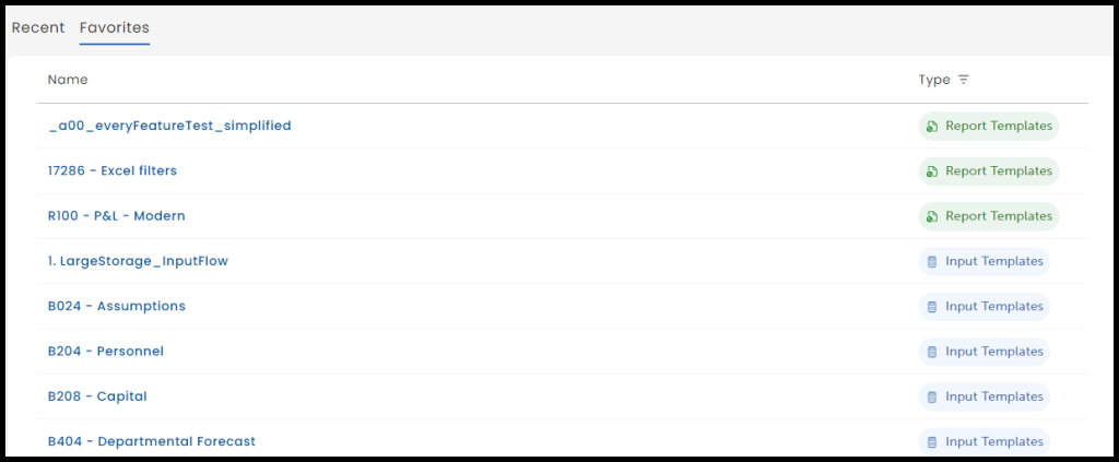 The Favorites section of the Solver homepage will contain a list of the work items that have been marked as a favorite. This list contains the name and the type of work item. The favorites list may also be filtered by the type of work item by clicking on the icon next to the type column and selecting the boxes of the preferred filters.