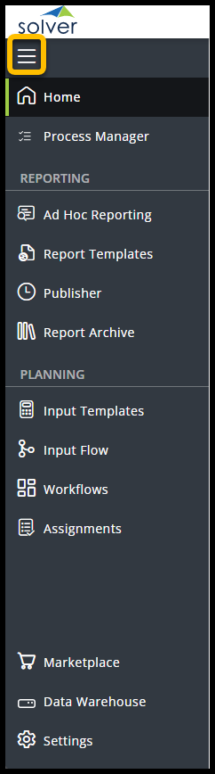 Use this toolbar to access the tools that you have the ability to access in Solver. While using the application, users may collapse the toolbar by clicking on the icon above the Home tab and expand it again with another click.