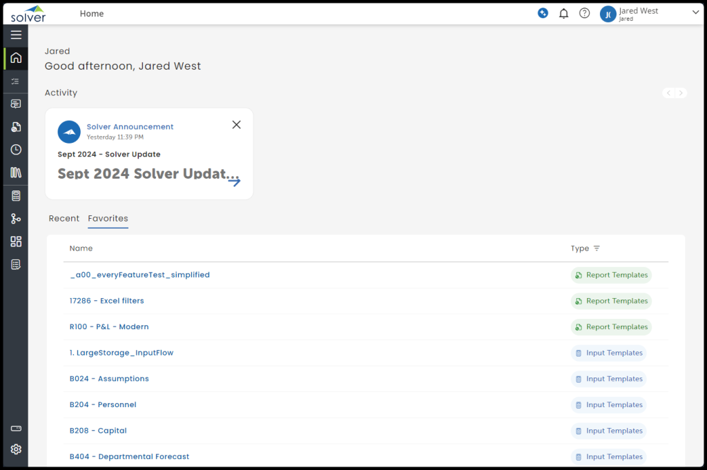 Solver’s home screen provides users with helpful information and contains a personalized view of their relevant activity in Solver as well as access to the tools at their disposal.