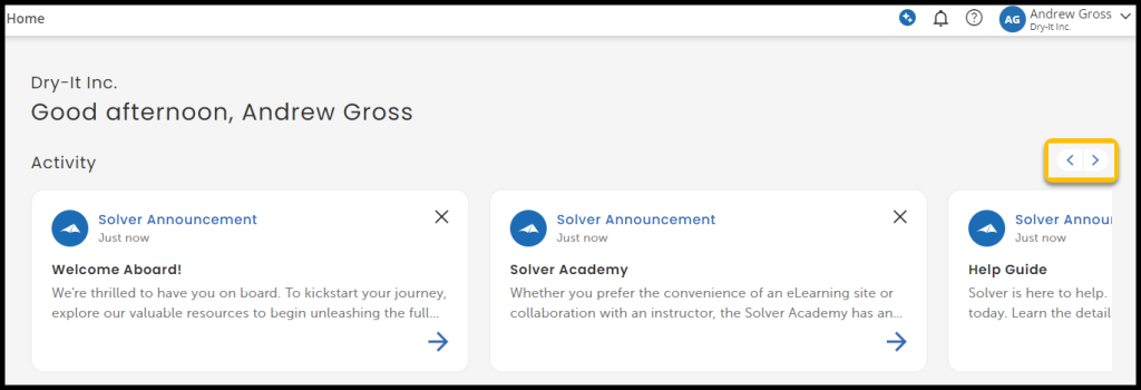 This section of the homepage will contain cards that are notifications for the user logged into Solver.