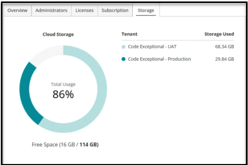 Navigating to Settings > Administration > Storage, a visual of their total used storage and details per tenant are displayed.