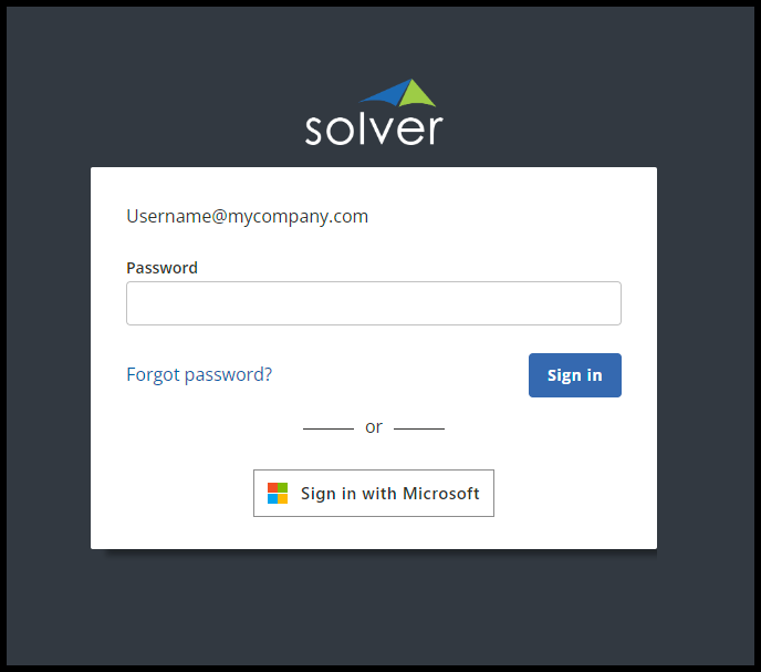 Solver supports Microsoft Entra ID (MEID), enabling an organization to manage user access to Solver from a single location: the organization’s Microsoft Entra ID. Users can opt to log in via Microsoft Entra ID on sign-in, or this can be enforced by an administrator.