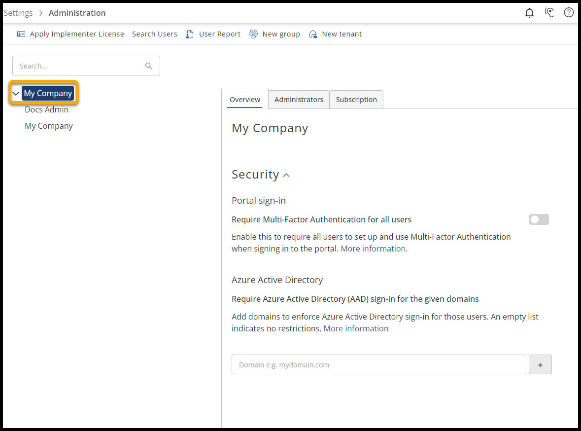 2. Select the top option on the tenant list to see the overview of your security settings.