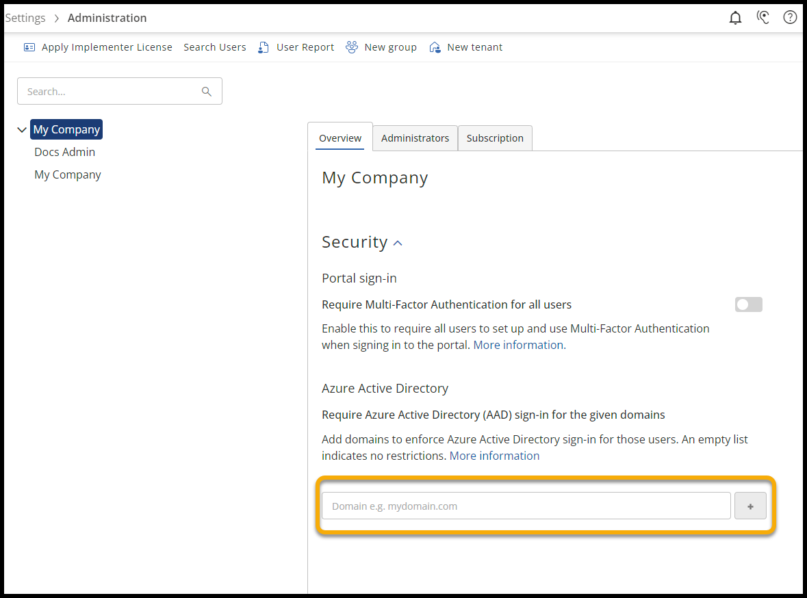 3. Type your domain name (mycompany.com) in the text box at the bottom of the overview menu and click the + icon to add it to the MEID settings.