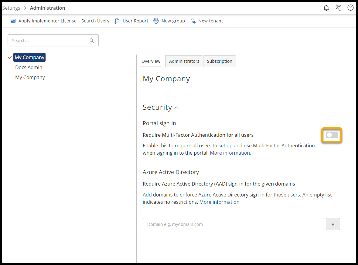 4. Toggle the switch next to “Require Mult-Factor Authentication for all users” to enable this setting.