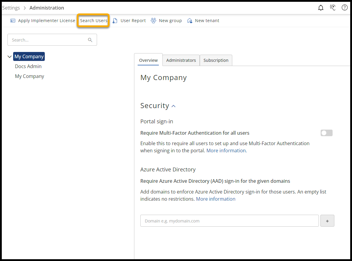 1. As a customer admin, once logged in, click on Settings and select the Administration menu option.