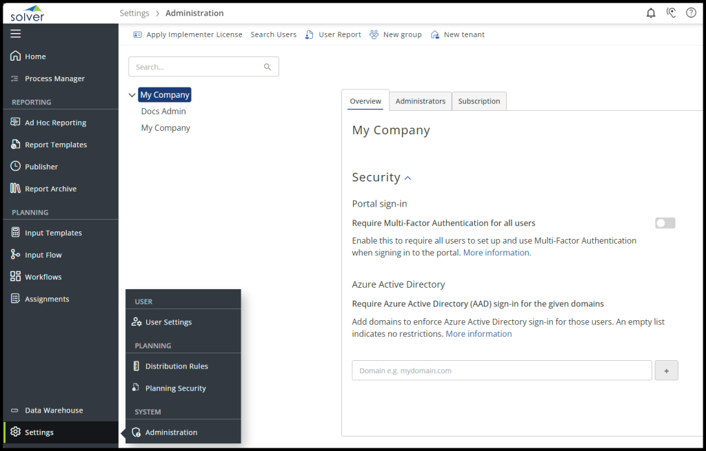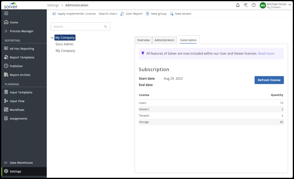 In order to use the Solver app, users must be assigned at least a Reporting License. Additional features such as Report Designer can then be added as well. Licensing is shared amongst all tenants you own that they have access to. For example, if a user is assigned a Report Designer license, this user will be a Report Designer across all tenants you own.
