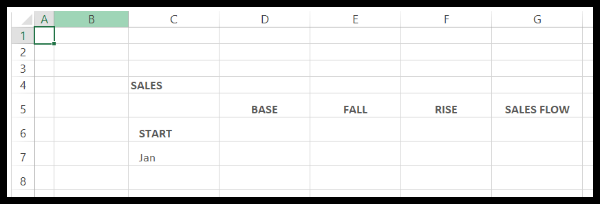 To get started, organize the data that the Waterfall Chart will be illustrating. Below is a typical setup for a standard Sales Flow for the year (the remaining months, followed by END, will be added in a later step).