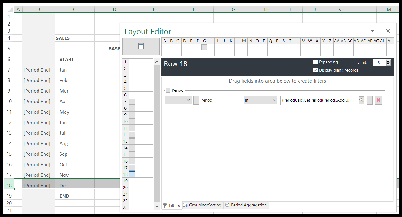 - With Auto Parameters on, drag and drop Period End into the cell to the left of January and create a group on the row.