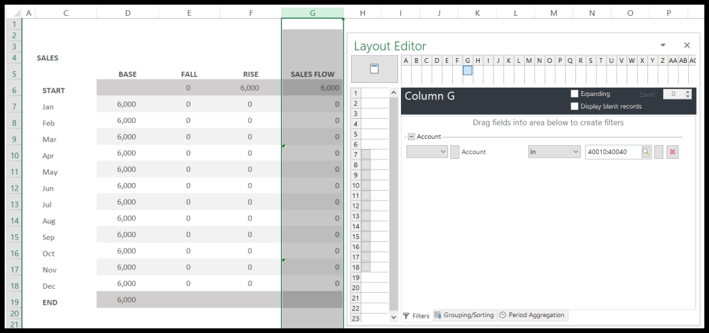 - Next, establish which Monthly Amounts to pull in. Make a group on the SALES FLOW column and assign it to Accounts. In the example shown, this is for accounts 40010:40040.