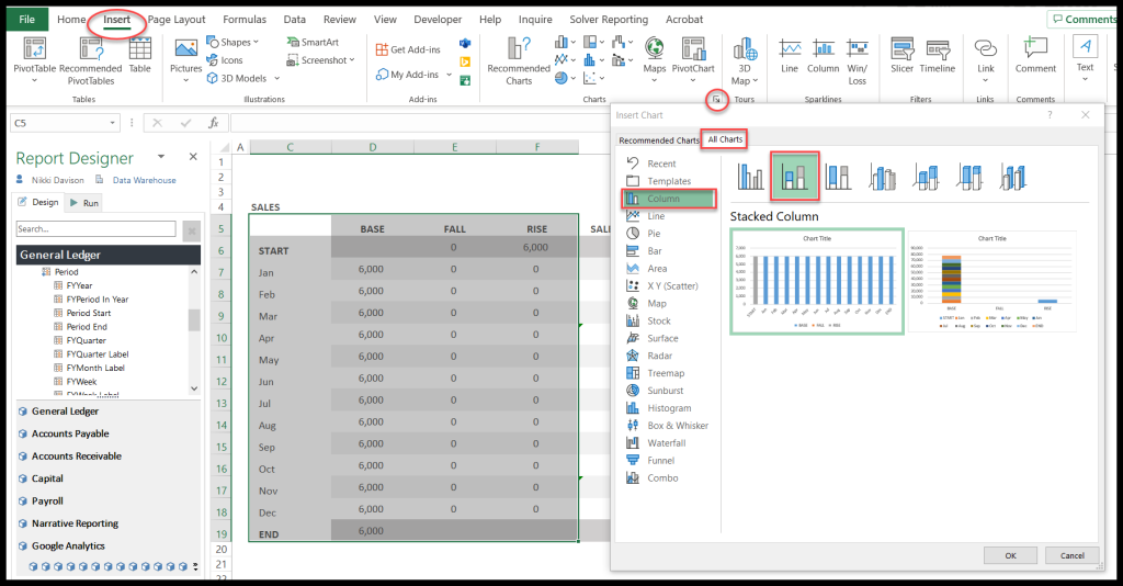 Now, to create the chart, select the data for everything except the Sales Flow column, click the Insert tab in the Ribbon, and choose the Stacked Column Chart.