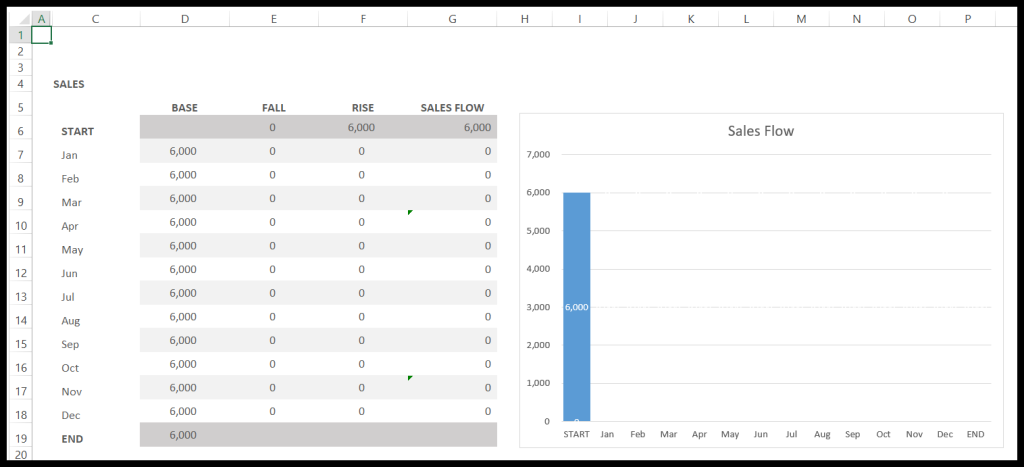 - The SALES FLOW column will need a figure to act as its starting point for the year. In our example, this is 6,000. Type your starting point figure under SALES FLOW in the START row.