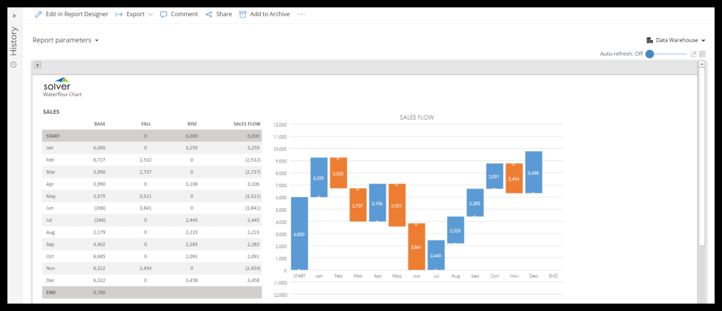 Because Waterfall Charts are based on the ending point of the previous month, a PeriodCalc is needed to manipulate the figures. To do this, follow these steps: