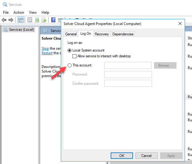 - On the Log On tab, select This account.