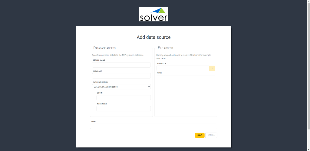 Because Solver is a cloud service, and many of our users have on-premise ERP systems, we introduce Solver Cloud Agent. The Cloud Agent is a gateway agent that acts as a bridge providing fast and secure data transfer between the on-premise ERP data and the Solver portal.