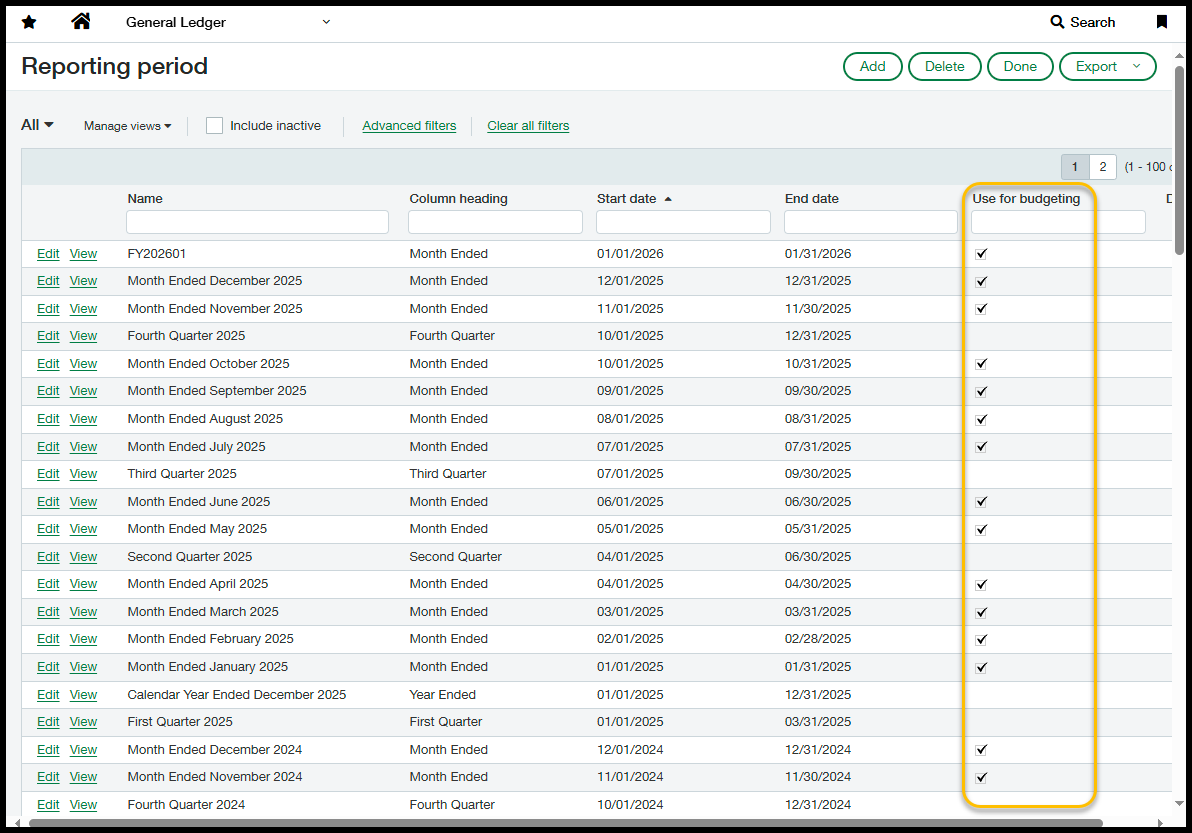 - In the grid of configure periods that have been created, click the checkbox to make a period budgetable to enable Solver to bring in data associated with this period for the GLACCOUNTBALANCE object. This object is used to load GL data, including beginning balances.
