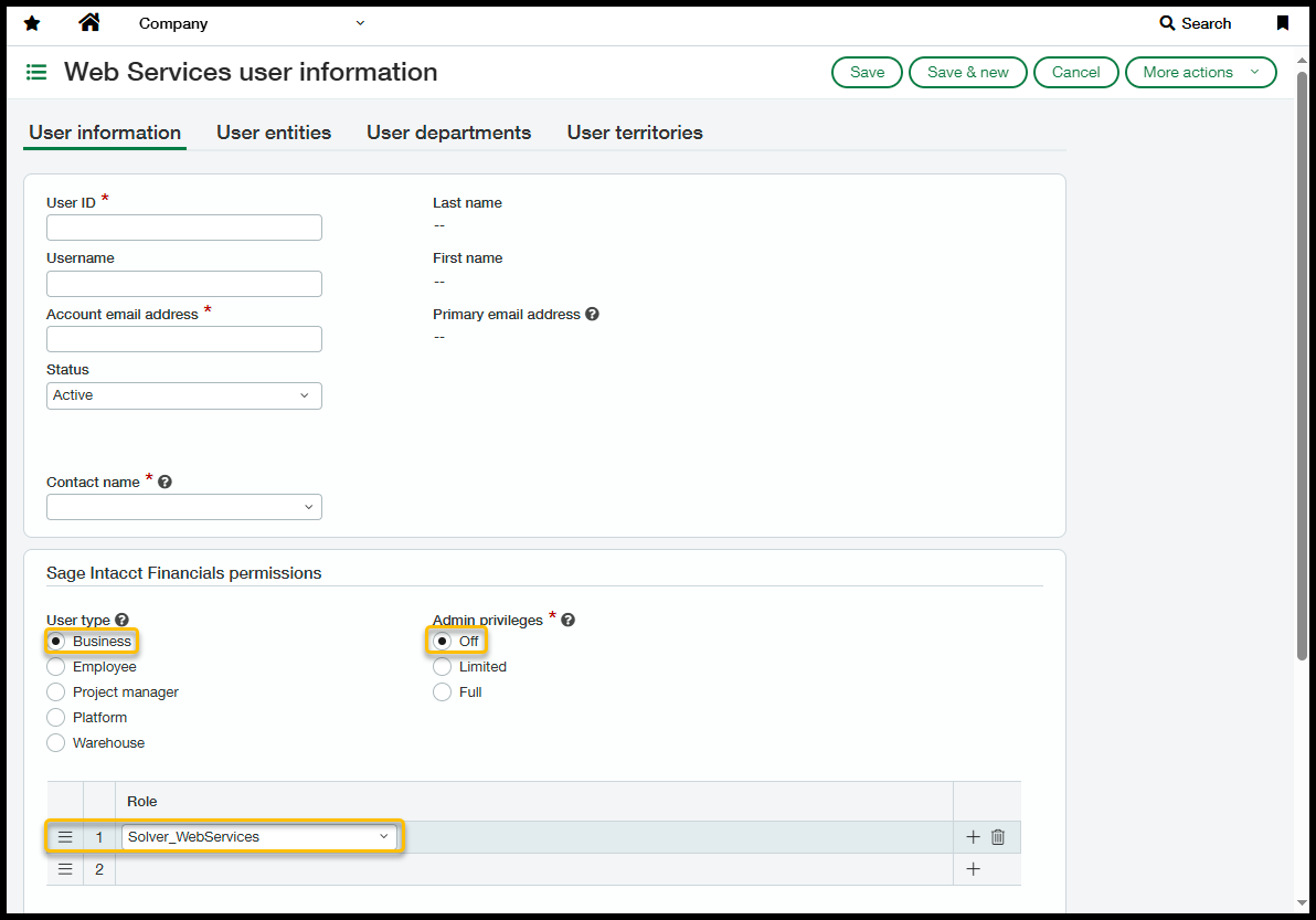 - The Solver connector does not include a user account for Intacct. Additional charges may apply when creating a web service account.