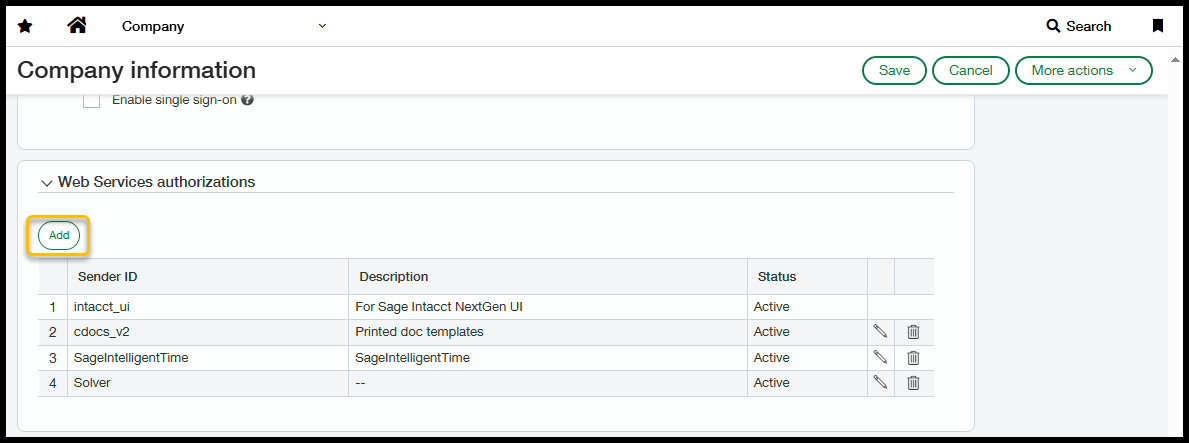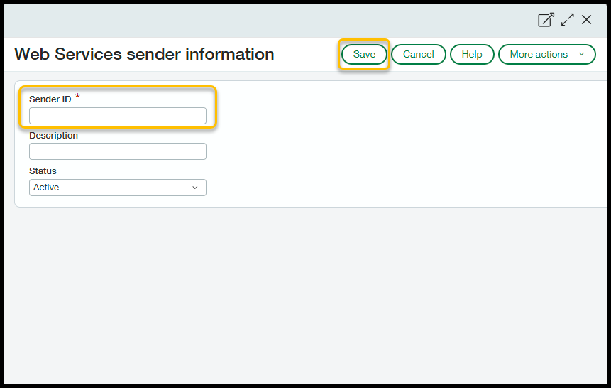 - In the popup, for the SenderID type in Solver. You can leave Description blank, and for status, set it to Active once you are ready to connect your Intacct System to Solver.