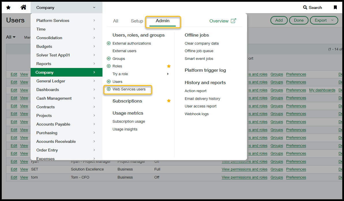 Consult your Intacct admin or consultant for information on creating an account to access data. The following outlines the process for creating a web service account to connect to Solver. Your Intacct admin should review these steps before creating the account to ensure it follows internal account usage.