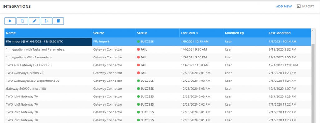 • Status: Gives real time update on the status of each integration, and whether they succeeded or failed