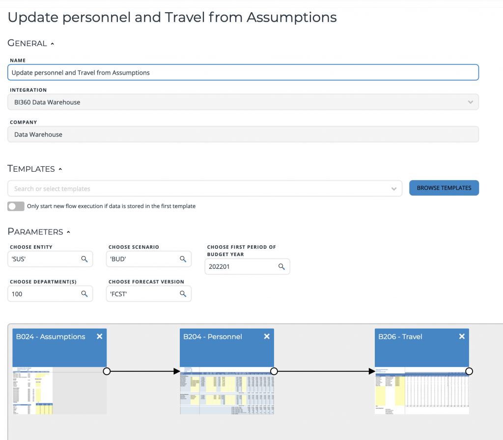 • Parameters will flow through the templates so that if user A runs a template for Dept. 100, the related templates also run for that department.