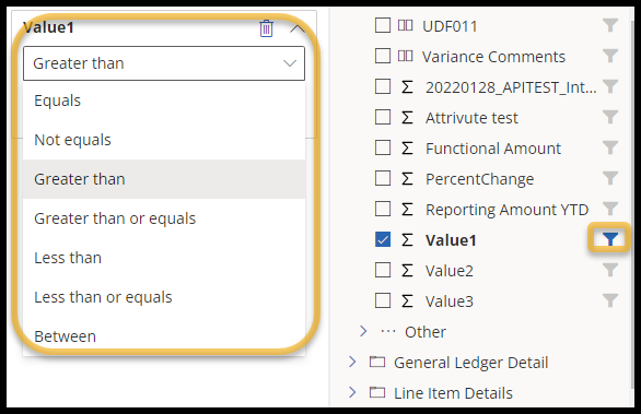 • Added the ability for users to filter in Ad Hoc on attributes including measures (Value1, Value2, Value3) by equals, not equal, greater than, greater than or equals, less than, less than or equals, and between.