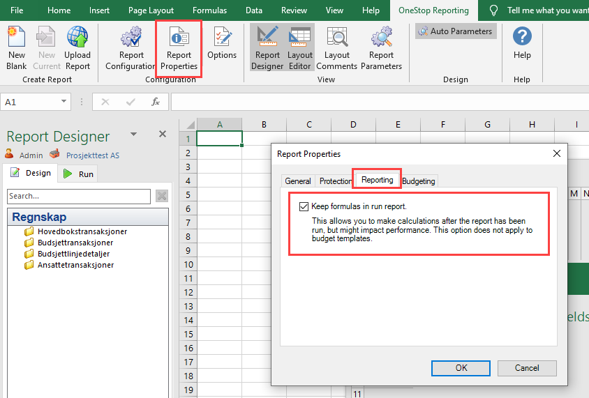 Users can control the formula settings for a report template from the Report Properties in Report Designer. On the Reporting tab, there is now a Keep formulas in run report checkbox. If this checkbox is deselected, the formulas are removed from the report.