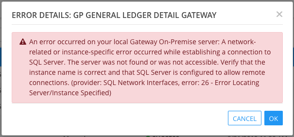 - Messaging has been clarified when errors are propagated through the on-premise Gateway. Please note: the updated messaging for the Gateway will require the updated Gateway installation. The installer can be found on the Connectors Marketplace.