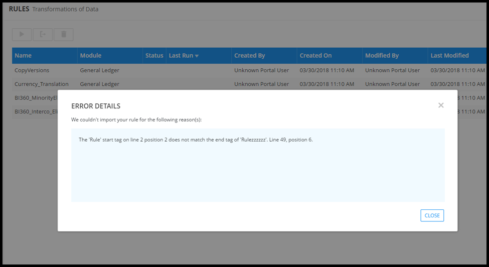 - Added improved error messaging when importing business rules. This includes more detailed pop-up error messages for XML and SQL errors.