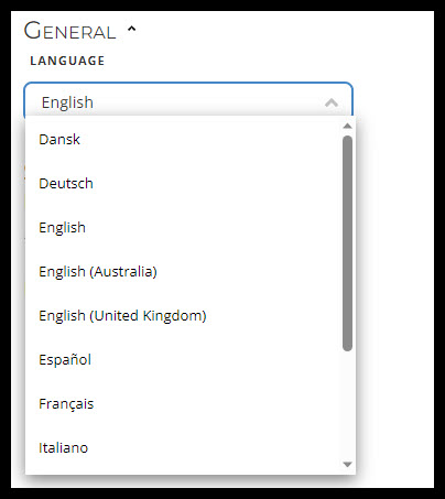 - Change language: changing the language will update the application to the language and regional settings of the option selected, including dates and number formats.