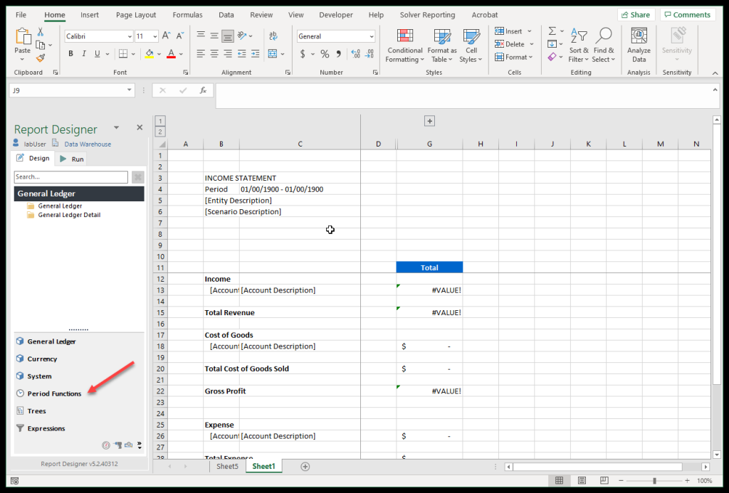 When designing a Report, the user may need a certain type of Period that is not found in the Period Functions menu. Solver Report Designer (RD) comes with default period calculations (PeriodCalcs) that are available in the Period Function menu found in the RD Navigation pane.