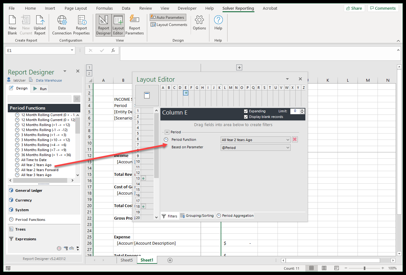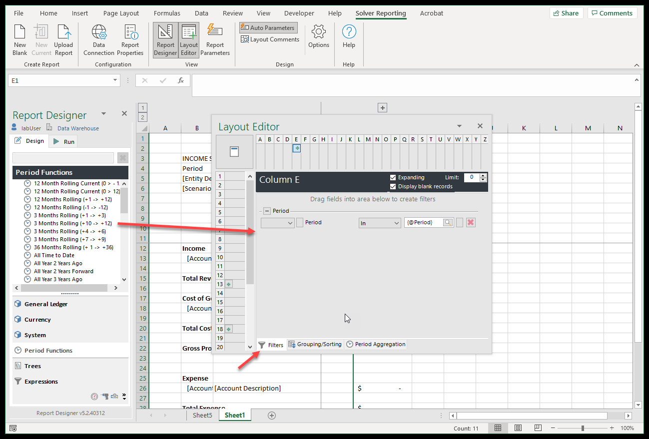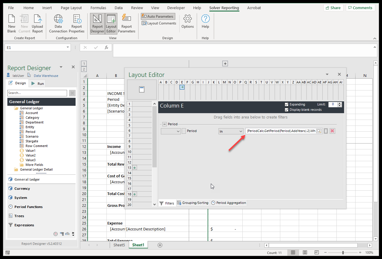 1. Click on the expanding column or row in the Layout Editor. In many cases, Period is a parameter defined on the Filters tab.