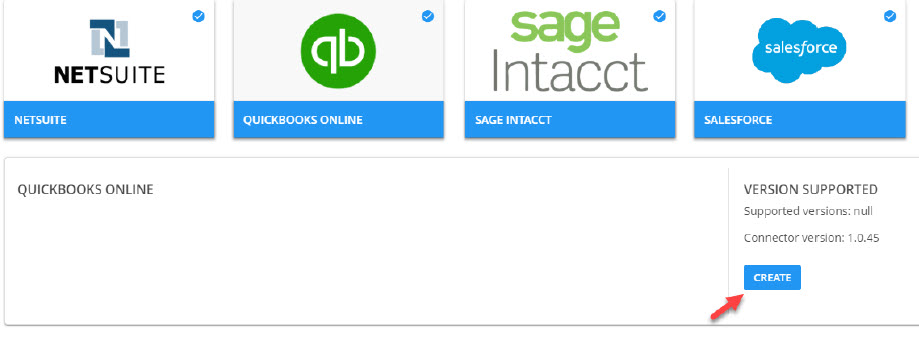 - The Solver Connector Marketplace will appear, scroll to and click on the QuickBooks Online tile. The tile will expand and select Create.