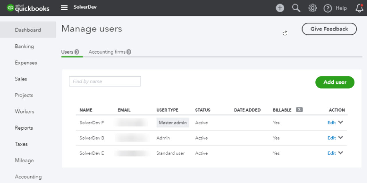 In the above screenshot, three users are shown. Only SolverDev P and SolverDev B can log in to QuickBooks from the Solver Cloud QuickBooks connector. In other word, only users with User Types of either “admin” or “master admin” can connect QuickBooks to Solver.
