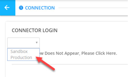 - The first page of the QuickBooks connector will load. In the dropdown, select whether to connect to your QuickBooks Sandbox or Production Environment.