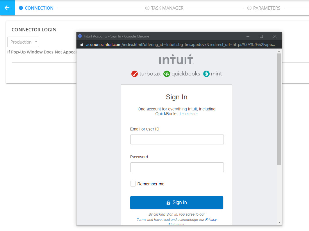 - Upon selecting an option, a popup will appear prompting you to log in with your QuickBooks credentials. Type them in and click Sign In.