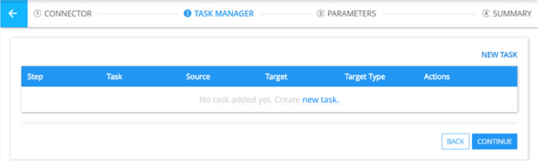 - After clicking connect, the credentials will be authenticated. Assuming that the credentials are valid, the Task Manager tab will load and you can build your first integration task. Click on new task to begin this process.