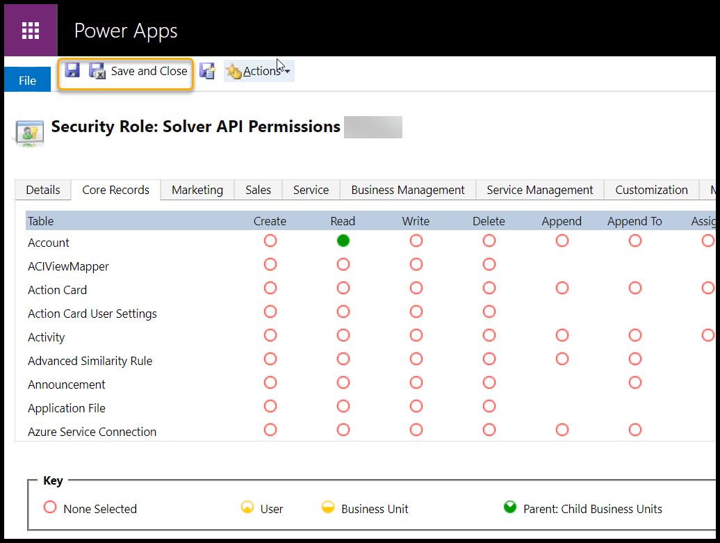 - From the Security Role list, select the pre-determined role name (ex: Solver API) to edit the permissions. This can be an existing or new role.